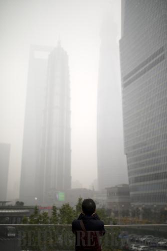 A tourist visits the Lujiazui financial area in Shanghai on December 9, the seventh day of consecutive hazy weather in the city (XINHUA) |