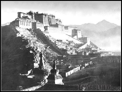 Built during the period of Tubo King Songtsan Gampo in the 7th century, the Potala Palace (here seen in 1956) was originally called Red Hill Palace Castle (Phodrang Marpa Trize in Tibetan). Wind, rain, lightning and war eventually destroyed the old palace. In the early Qing Dynasty, led by the Fifth Dalai Lama Ngawang Lobsang Gyamco, the Potala Palace saw large-scale extension, reaching its present-day grandeur. During the extension, Qing Emperor Kangxi gave orders to select skilled craftsmen from across the nation and send them to Tibet to take part in the project. Since the 1980s, the Potala Palace has undergone two large-scale repairs, with experts and technicians of numerous ethnic groups participating. Potala Palace reflects the wisdom and painstaking efforts of many craftsmen of ancient China and is a cultural treasure of the Chinese nation. Over the past millennium, it witnessed a slave society, feudal society and new socialist era, and the long and close historical and cultural contacts between Tibet and the hinterlands of China, and deep friendship between the Tibetan and the Han and other ethnic groups.