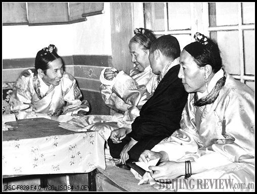 The four Galoins of the Gashag government--Ngapoi Ngawang Jigmei, Siangar Chomei Dorje, Liushia Tubdain Tarpa, and Sangpo Cewang Rinzin (from left)--handled public affairs in their office in the Norbu Lingka (1957).