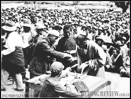 Staff with the Lhasa Military Control Commission handing out traveling expenses to the rebels who laid down their arms so they could return home (1959)