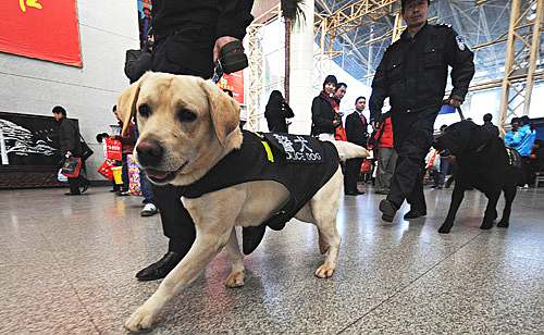 Railway police officers with explosive-sniffing dogs patrol Kunming Railway Station in southwest China's Yunnan Province on January 30 (LIN YIGUANG)