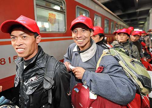 Migrant workers queue in lines before boarding a charter train at Fuzhou Railway Station in southeast China's Fujian Province on February 2. The first charter train for migrant workers carried some 450 passengers from Fuzhou Railway Station on February 2. All passengers onboard received gifts including candy, snacks and books (ZHANG GUOJUN) |