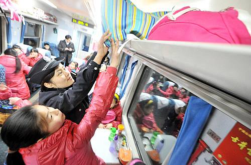 Gao Jun, a railway police officer at Hefei Railway Station in east China's Anhui Province, helps hearing-impaired children put their luggage away on February 2. Hefei Railway Station opened a green line for a group of 18 hearing-impaired children from the Art Troupe of the Hefei Special Education Center, who will appear on television during the upcoming Spring Festival celebration in Beijing (GUO CHEN) |