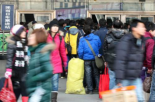 Passengers queue in lines at Beijing West Railway Station on January 17 (RAO QIANG)