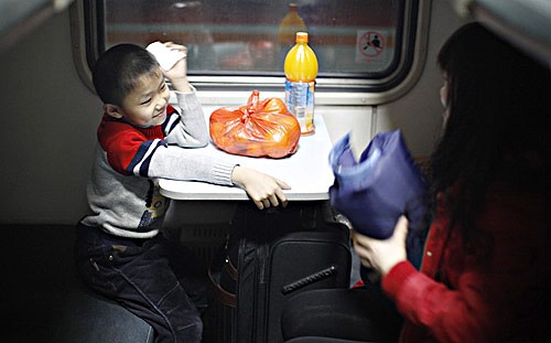 A boy looks at his mother on the L101 train from Beijing to southwest China's Chongqing Municipality on February 3 (CAI YANG)