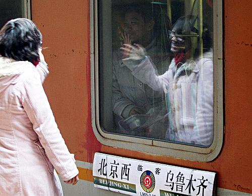 A girl's reflection appears on the window of a train from Beijing to Urumqi, northwest China's Xinjiang Uygur Autonomous Region, as she waves to a friend at Beijing West Railway Station on January 23 (RAO QIANG)