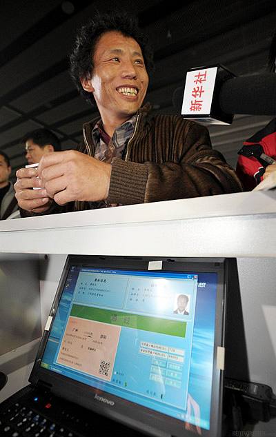 Tang Jieyuan, a native of Shaoyang, central China's Hunan Province, holds the country's first real-name train ticket, passing the verification system at Pazhou Passenger Spot in Guangzhou, south China's Guangdong Province, at 2 p.m. on January 29. This year Chinese authorities have implemented a real-name verification system to curb scalping at 37 railway stations during the holiday rush. The pilot project was launched in Guangdong, Hunan and Sichuan provinces, because millions of migrants from inland Sichuan and Hunan work in Guangdong (LIU DAWEI) |