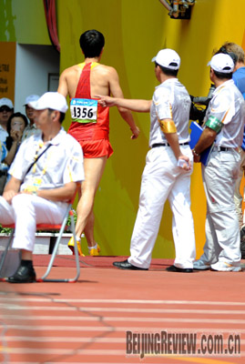 SHATTERED DREAM: Liu Xiang leaves the track after failing to qualify in the men's 110-meter hurdles due to injury |