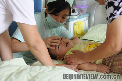 SICK BABIES: An infant who developed kidney stones after drinking a tainted powdered milk product receives care from a nurse. The government has pledged to cover the costs of medical treatment for the more than 6,200 babies who drank the tainted formula