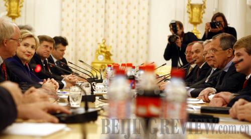 A NEW START: U.S. Secretary of State Hillary Clinton (second left) and Russian Foreign Minister Sergey Lavrov (second right) hold talks on issues including a new nuclear strategic arms reduction treaty in Moscow on October 13, 2009 (JIN BO) |