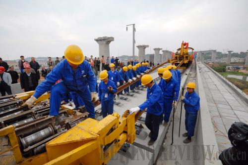 LAYING DOWN THE LINE: Workers lay seamless tracks on the Wuhan-Guangzhou High-Speed Railway, which was put into operation on December 26, 2009 (LIU SHANGWEN) | The MOR release said China's high-speed train technologies have reached the world's most advanced level. Based on mastering core technologies for high-speed trains capable of traveling 200-250 km per hour—the same as those abroad—China has solved the difficulties that restrict speed increases. With innovations in key technologies and manufacturing technologies of its own, China has successfully established a technology platform for trains with a speed of 350 km per hour.
