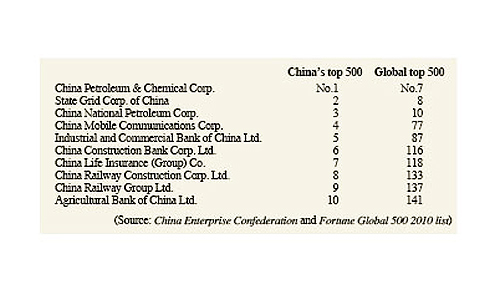 China's 2010 top 500 firms generated a net profit of $220.2 billion, representing a surge of 20 percent year on year, 3.2 percentage points faster than global top 500 companies.