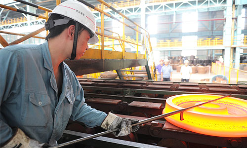 RUNNING TO EUROPE: An employee works on a train wheel production line in Maanshan Iron & Steel Co. Ltd. in Anhui Province. The company's train wheels won German quality authentication earlier this year and have been exported to the EU market (WANG LEI) |
