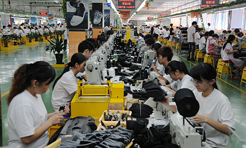 BEAR THE BRUNT: Employees work on the production line of a shoe-making factory in Quanzhou, Fujian Province. Drastic appreciations of the yuan will severely affect China's labor-intensive export-oriented enterprises (LAI JIANQIANG) |