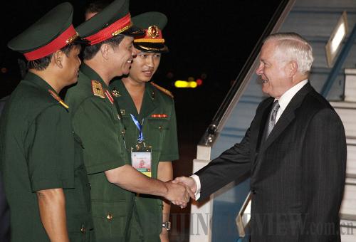 CLOSER MILITARY RELATIONS: Vietnamese officials greet U.S. Defense Secretary Robert Gates upon his arrival in Hanoi for a visit on October 10 The author is a researcher with the China Institutes of Contemporary International Relations 10 (XINHUA/AFP) |