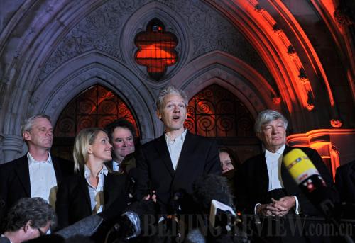 (XINHUA/AFP) | The founder of WikiLeaks, Julian Assange, speaks to the media after being granted bail in London on December 16.