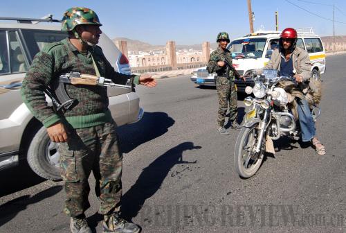 Yemeni soldiers stop a motorcycle at a checkpoint in Sanaa on February 4.