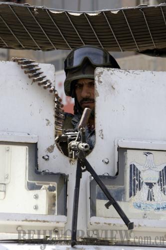 An Iraqi policeman mans a machine gun at a checkpoint in Baghdad on September 2, a day after the U.S. military formally ended combat operations in Iraq.