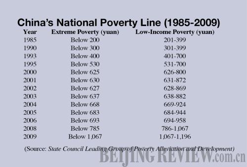 According to the State Council Leading Group of Poverty Alleviation and Development, from 2001 to 2009, China reduced poverty significantly. In 2000, the number of people living below the poverty line was 94.23 million, or 10.2 percent of China's total population of 1.3 billion. In 2009, those living below the poverty line totaled 35.97 million, or 3.8 percent of the population.