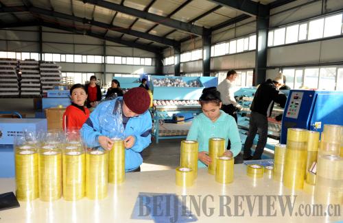WELCOME INVESTMENT: Employees at a scotch tape plant in Kyrgyzstan tend to tape products. The company has investment from Chinese investors (SHA DATI) |