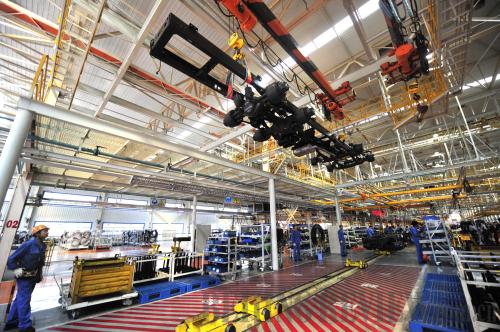 STRONG SOE: An auto frame hangs over the assembly line at Donfeng Motor Corp.'s heavy truck manufacturing base in Shiyan, central China's Hubei Province. Dongfeng is one of China's largest state-owned auto makers (HAO TONGQIAN) |