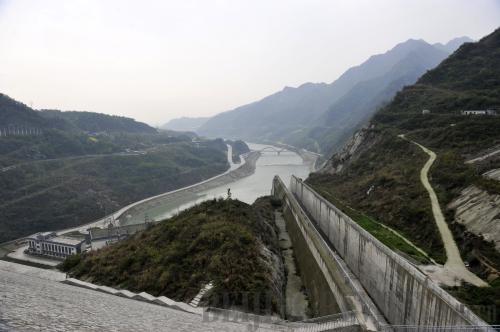 BACK ON THE JOB: Water flows out of the Zipingpu Reservoir in a channel. Consolidation of the earthquake-damaged reservoir is ongoing (SHI GANG) |
