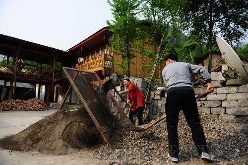 REBUILDING A HOME: Lin Xingcong and his wife Li Yunxiang work on the gate of their new house in Anxian County, Sichuan Province, on May 10 (XINHUA) |