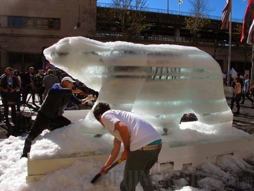 WARMING WOES: Ice sculptors work on a polar bear sculpture in Sydney on June 3 during an event aimed at raising public awareness of global warming (TANG MING)