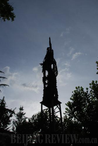 WITNESS TO THE PAST: The Memorial Tower of the Chinese Railroad Workers in Shanghai, presented by Illinois state in January 1991. The middle pole of the 1.5-ton steel sculpture connects 3,000 railroad spikes. The tower commemorates Chinese workers' contribution to railroads linking the U.S. coasts (CHEN RAN) |