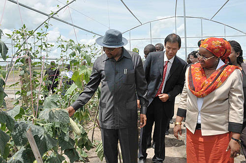 AGRICULTURAL BOOST: Tanzanian President Jakaya Kikwete (left) visits a farm at a Chinese Government-sponsored agricultural technology demonstration center in Tanzania's Morogoro Region on April 2 (GUO CHUNJU) |