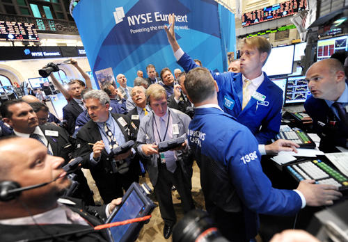 MARKET IMPACT: Traders at the New York Stock Exchange on June 1, the day major U.S. stock indexes fell sharply following Moody's lowering of Greece's sovereign credit rating (SHEN HONG)