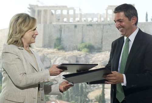 JOINT EFFORTS: U.S. Secretary of State Hillary Clinton and Greek Foreign Minister Stavros Lambrinidis exchange a signed document on July 17 in Athens. Clinton said the United States supports Greece's efforts to address its debt crisis (XINHUA/AFP) |