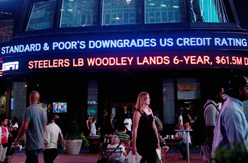 DOWNGRADING THE COUNTRY: A news ticker on Standard & Poor's lowering of the United States' credit rating in Times Square, New York City, on August 5 (XINHUA/AFP) |