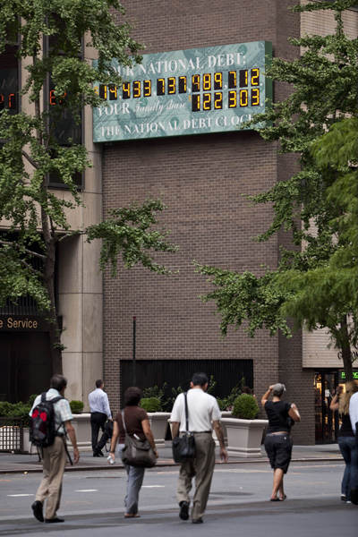 ALL CLEAR: The National Debt Clock in New York City shows the increasing U.S. debt on August 1 (XINHUA/AFP) |