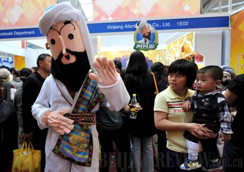 ATTRACTIVE EXPO: The famous local mascot Avanti draws the attention of visitors at the First China-Eurasia Expo (WANG FEI) |