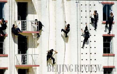 MOVING UP: Chinese special police officers take part in an antiterrorism drill in Beijing on September 23, 2010 (CFP)