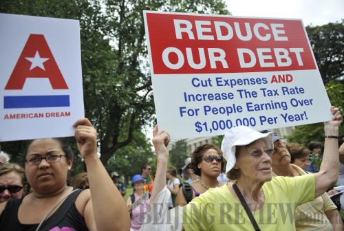 DEBT WOES: Protesters call for national debt cuts during a demonstration in Washington D.C. on July 28 (ZHANG JUN) |