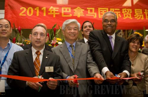 REACHING OUT: Bao Esheng (center), head of the Office of Commercial Development of China in Panama, cuts a ribbon to inaugurate the China Pavilion at Expocomer 2011 in Panama City on March 24 (WANG PEI) |