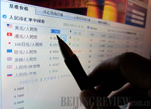 CONTINUOUS APPRECIATION: The central parity rate of the yuan hit 6.3483 per U.S. dollar, as shown on the official website of China Foreign Exchange Trade System on October 11, 2011 (GONG LEI) |
