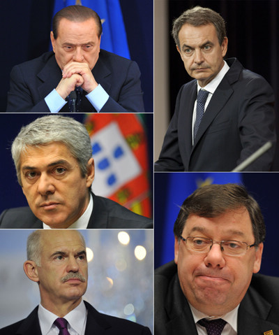 EX-PRIME MINISTERS: Clockwise from top left: Italy's Silvio Berlusconi, Spain's Jose Luis Rodriguez Zapatero, Ireland's Brian Cowen, Greece's George Papandreou and Portugal's Jose Socrates (XINHUA) |