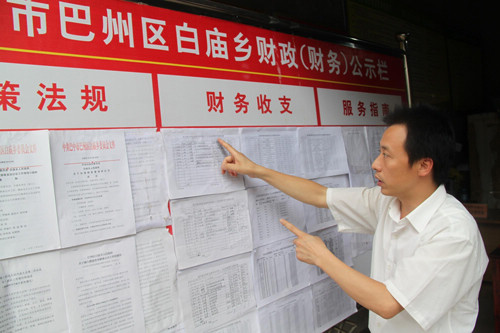 IN PUBLIC: Zhang Yingshang, head of Baimiao Town of Bazhong in Sichuan Province, explains the township government's finance on December 23, 2010 (LI XIANG) |