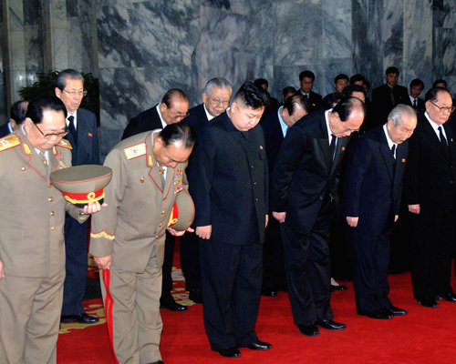 Kim Jong Un (third left, front row) mourns his father Kim Jong Il's death along with other North Korean officials in Pyongyang (XINHUA/KCNA) |
