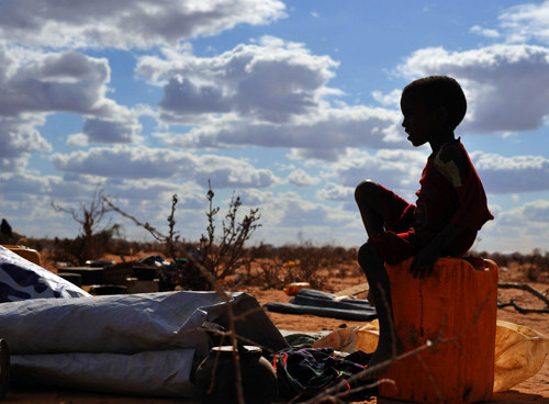 A Somali boy sits on a plastic bucket in Dadaab, the world's biggest refugee camp located on the Kenyan-Somali border (LIU CHAN) |
