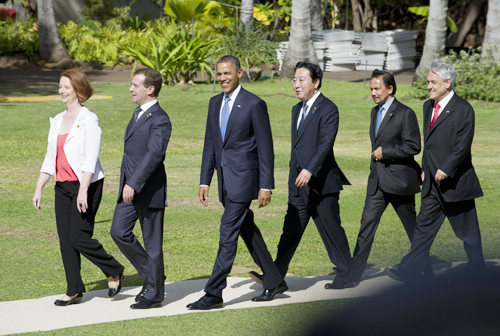 MARCHING IN: U.S. President Barack Obama with other Asia-Pacific leaders at the 19th APEC Summit in Honolulu, Hawaii, on November 13, 2011 (ZHANG JUN) |