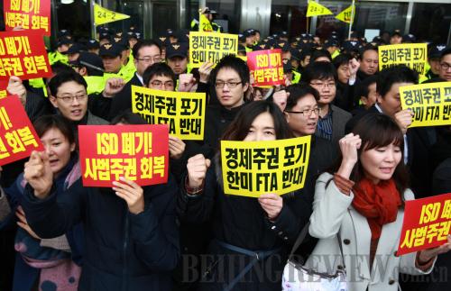 RESISTANCE: South Korean protesters demonstrate on November 22, 2011, in Seoul opposing the U.S.-South Korean free trade agreement (XINHUA)