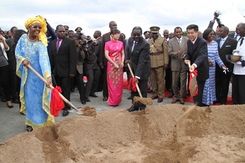 ASSISTANCE: China's Ambassador to Zimbabwe Xin Shunkang (front right), along with Zimbabwean President Robert Mugabe and his wife, lays the foundation for an orphan school project funded by the Chinese Government in Mashonaland Central Province on November 3, 2011 (LI PING) |