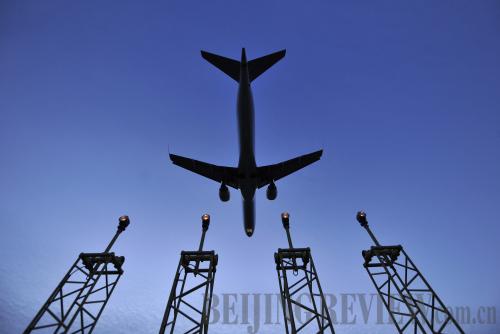 FLYING AT HIGHER COSTS: A plane lands at Brussels, Belgium. The new European regulations on carbon emissions by airlines came into force in January despite widespread opposition (WU WEI)