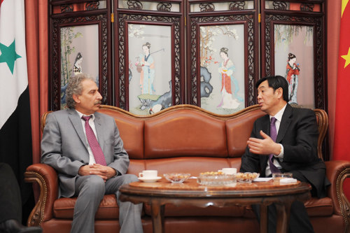 DIALOGUE: China's Vice Foreign Minister Zhai Jun (right), a special envoy of the Chinese Government, exchanges views with Loai Hussain, leader of the opposition Building Syria State Party, in Damascus on February 18 (QIN HAISHI)