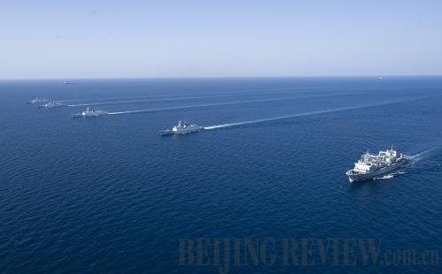 MARINE GUARDIAN: Chinese Navy vessels on an escort mission in the pirate-infested Gulf of Aden (FAN JUNWEI) |