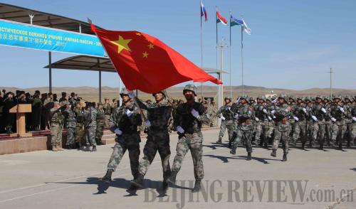 FOR PEACE: Chinese soldiers parade in the Matybulak range near the largest Kazakh city of Almaty on September 24, 2010, during a Shanghai Cooperation Organization antiterror drill (WANG JIANMIN) |